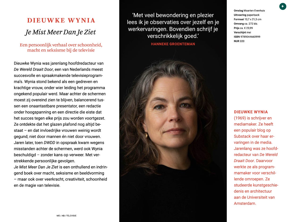 De enige die iets zegt waar ik me in kan vinden is Evert Santegoeds in Shownieuws: ‘Het is voor haar een heel belangrijk project [DWDD] geweest. Zij was de leidinggevende van één van de meest succesvolle programma’s die Nederlandse televisie gekend heeft de afgelopen twintig jaar. Ik kan me voorstellen dat zij ook een ander einde aan dat programma had willen zien, ook voor zichzelf. En dat ze nog met heel veel gevoelens zit waarvan ze denkt ja, ik ga gewoon eens vertellen wat er nou allemaal gebeurd is’. Met tot slot de nuchtere en rake opmerking van Bram Moszkowicz: ‘En laten we niet vergeten, we kennen de inhoud van het boek nog niet’.