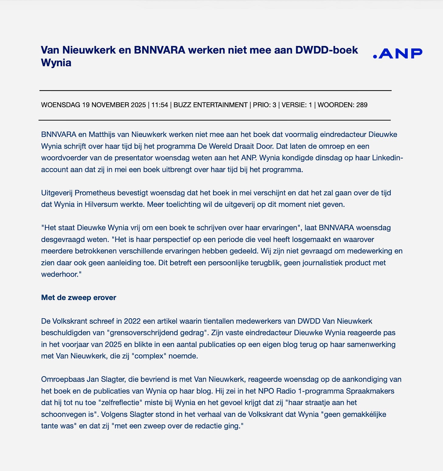 Op een subtiele manier wordt mijn boek door het ANP gereduceerd tot ‘DWDD boek’ en is niet het boek het nieuws, maar het feit dat Matthijs en BNNVARA niet meewerken. De nieuwsdienst heeft de omroep en Van Nieuwkerk gebeld, niet mij (alleen Shownieuws nam contact met mij op).
