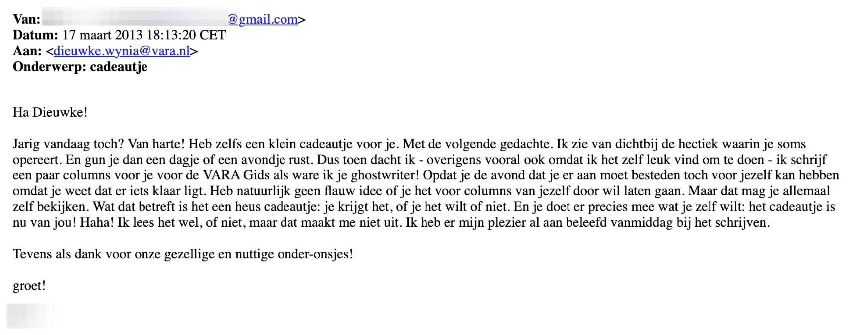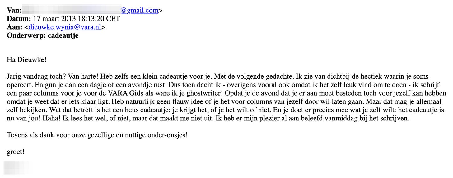 In de mail schreef hij: ‘Dus toen dacht ik - overigens vooral ook omdat ik het zelf leuk vind om te doen - ik schrijf een paar columns voor je voor de VARA Gids als ware ik je ghostwriter!’.