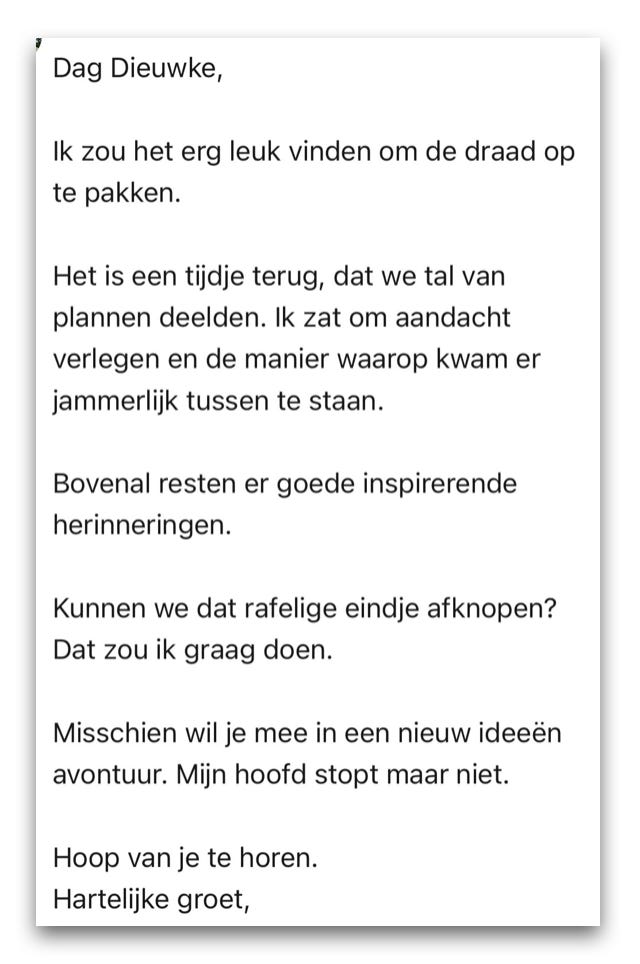 Ik antwoordde ‘Nee, is ok, was goed gesprek. Schrok alleen van je afscheid. Zal vast niet zo bedoeld zijn’.