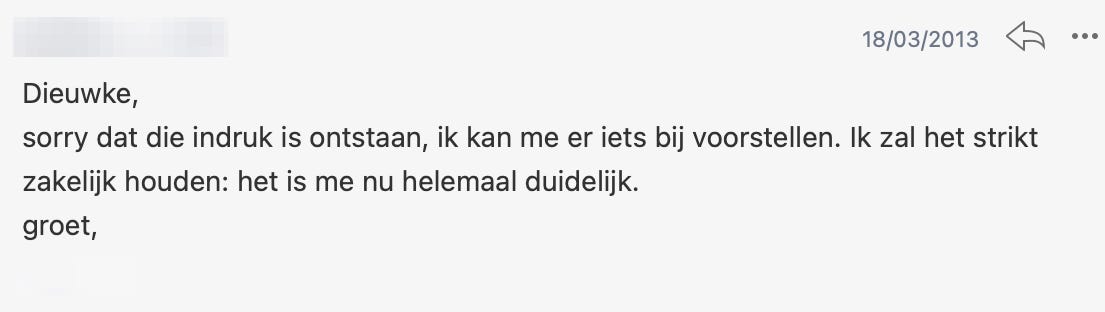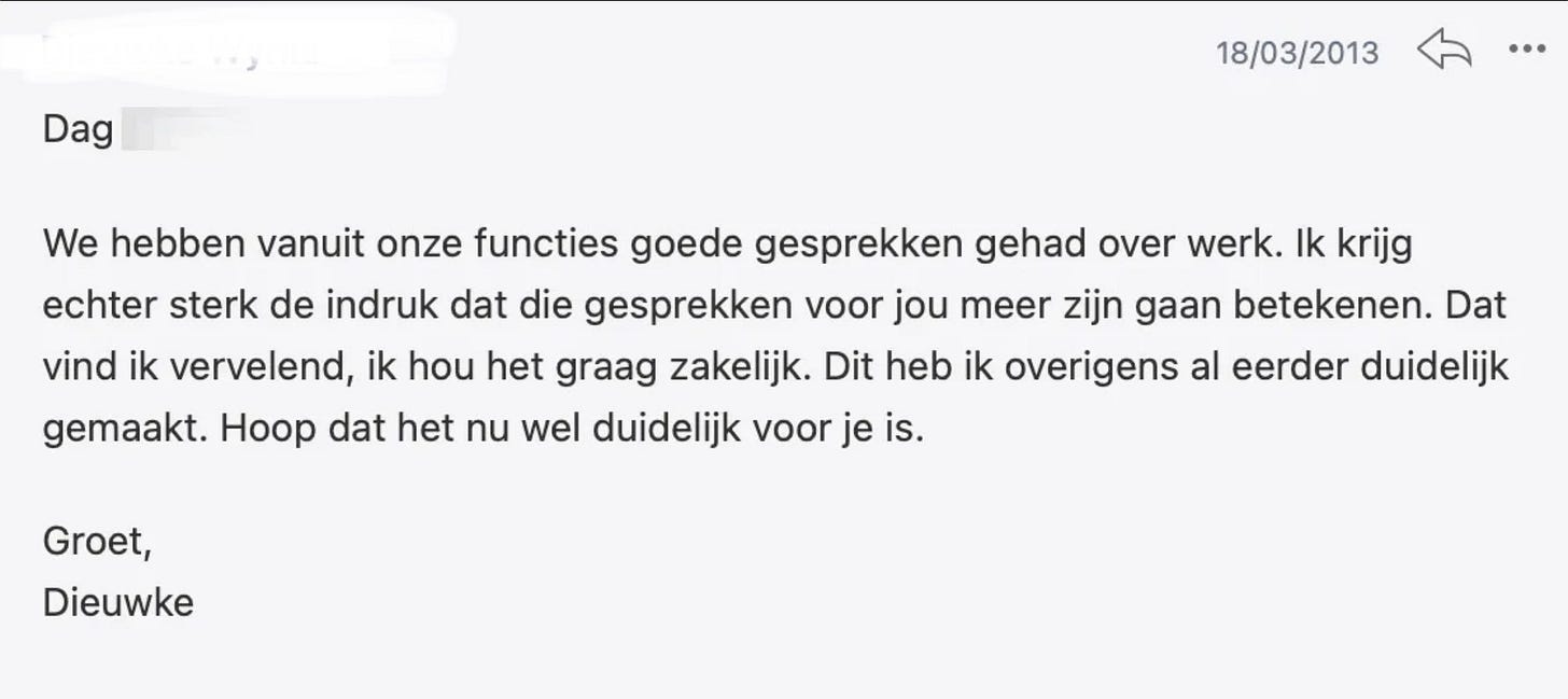 Indertijd zocht ik er niet direct iets achter, al was ik wel verbaasd. Ik kende de man nauwelijks, en een directielid dat zó persoonlijk wordt, me allerlei karaktereigenschappen toedicht, over bewondering schrijft en dan ook nog afsluit met ‘liefs’ – dat vond ik vrij ongemakkelijk.