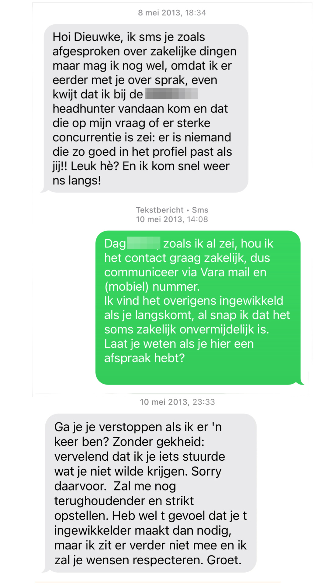 Na deze mailwisseling kwam er geen eind aan zijn toenaderingen. In tegendeel. Twee maanden later pakte hij de draad weer op en sms-te me om over zijn sollicitatie te vertellen.