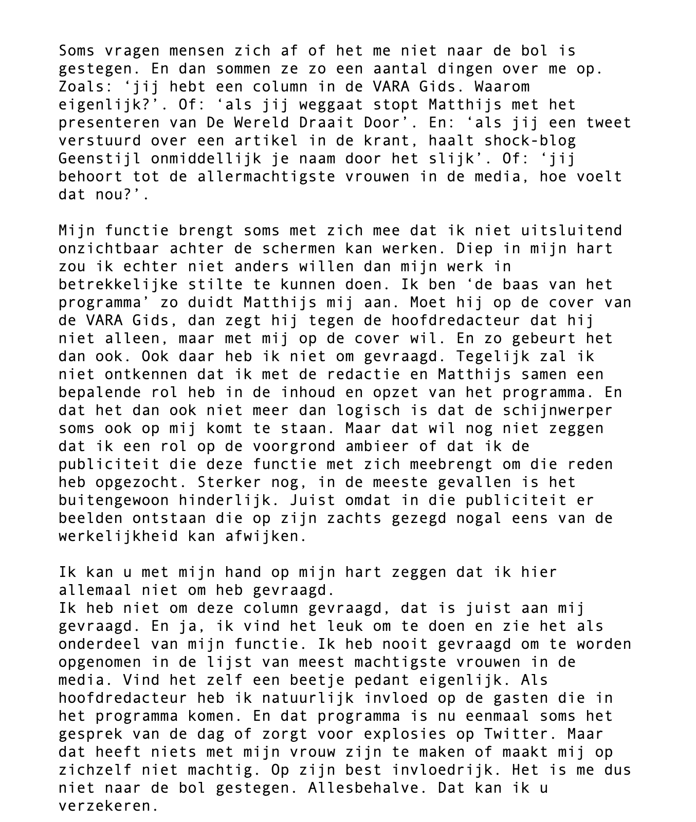 Ik maakte promotie en werd leidinggevende. Het gedrag stopte niet. In Vrouw in Hilversum schreef ik dat Matthijs mij bij mijn aantreden als eindredacteur in de VARAgids charmante meesteres noemde. Niet veel later ‘complimenteerde’ een senior redacteur me: hij had ‘nog nooit zo’n knappe eindredacteur gehad’. Na dat seizoen verlengde ik zijn contract niet - zijn werk was onvoldoende. Hij was in vaste dienst en bleef gewoon bij de omroep werken. Nog steeds is hij boos op mij, DWDD noemt hij een zwarte bladzijde in zijn carrière. Ik vraag me af of hij ook zo kwaad zou zijn als ik een man was geweest.